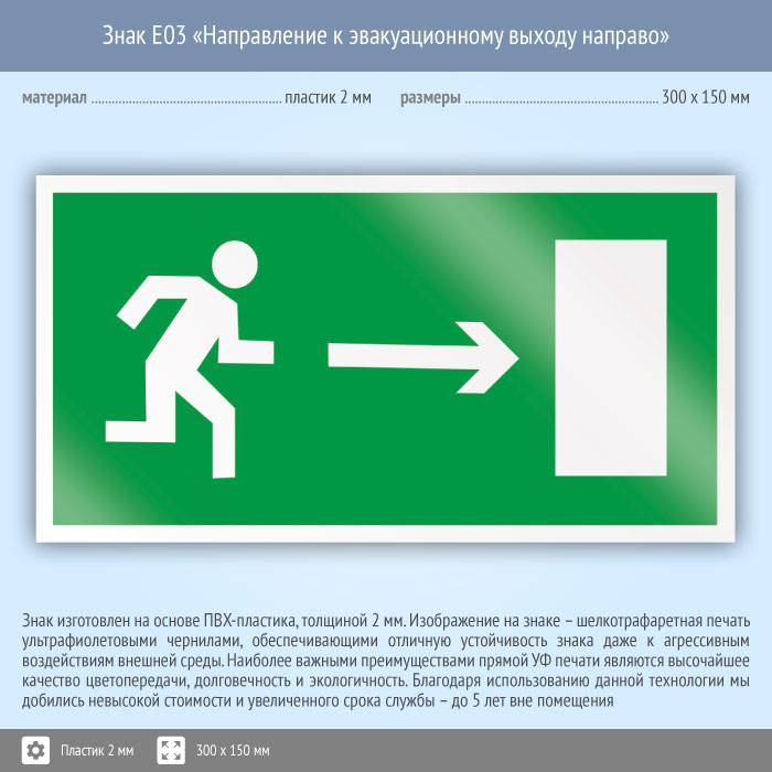 Знак E03 «Направление к эвакуационному выходу направо» (пластик, 300х150 мм) в Сургуте купить