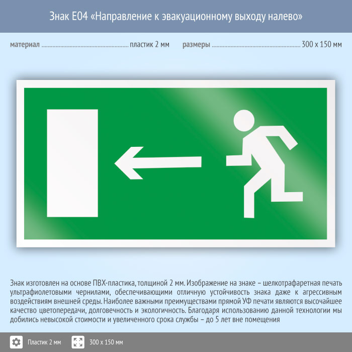 Знак E04 «Направление к эвакуационному выходу налево» (пластик, 300х150 мм) в Сургуте купить