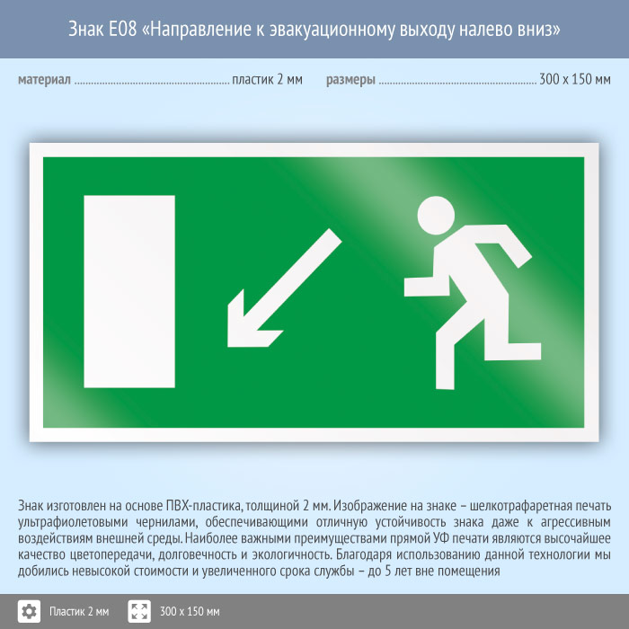 Знак E08 «Направление к эвакуационному выходу налево вниз» (пластик, 300х150 мм) в Сургуте купить