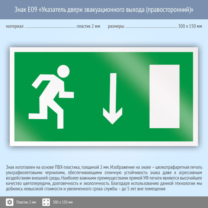 Знак E09 «Указатель двери эвакуационного выхода (правосторонний)» (пластик, 300х150 мм) в Сургуте купить