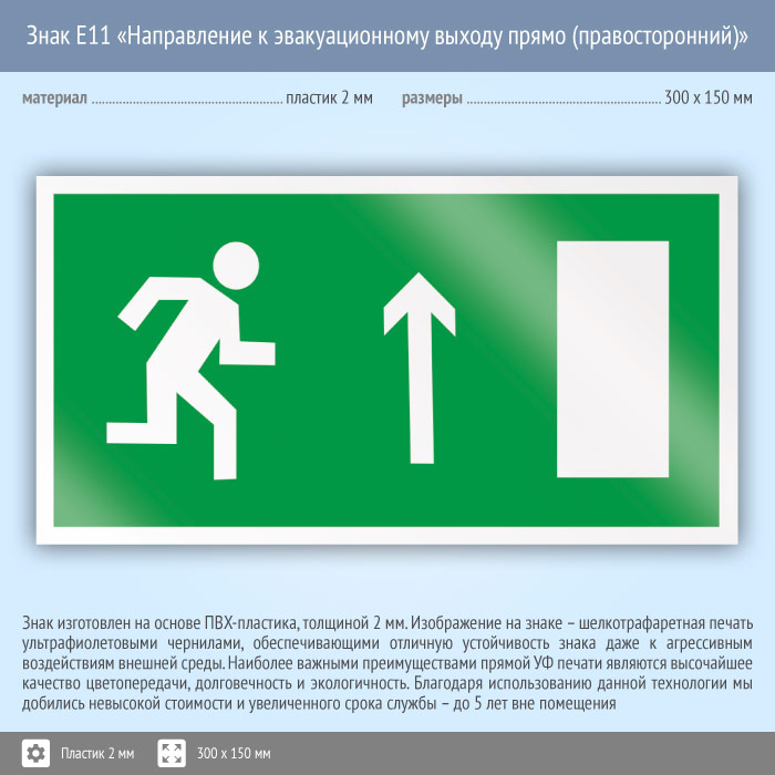 Знак E11 «Направление к эвакуационному выходу прямо (правосторонний)» (пластик, 300х150 мм) в Сургуте купить