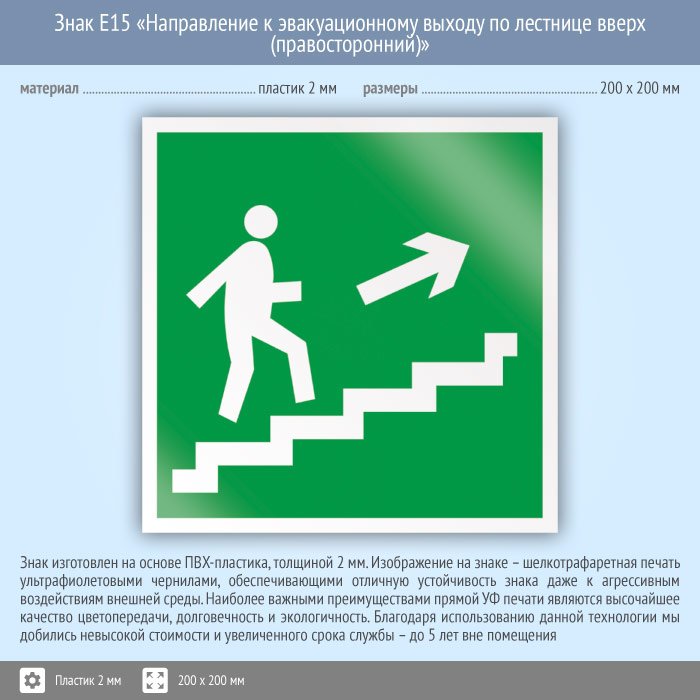 Знак E15 «Направление к эвакуационному выходу по лестнице вверх (правосторонний)» (пластик, 200х200 мм) в Сургуте купить