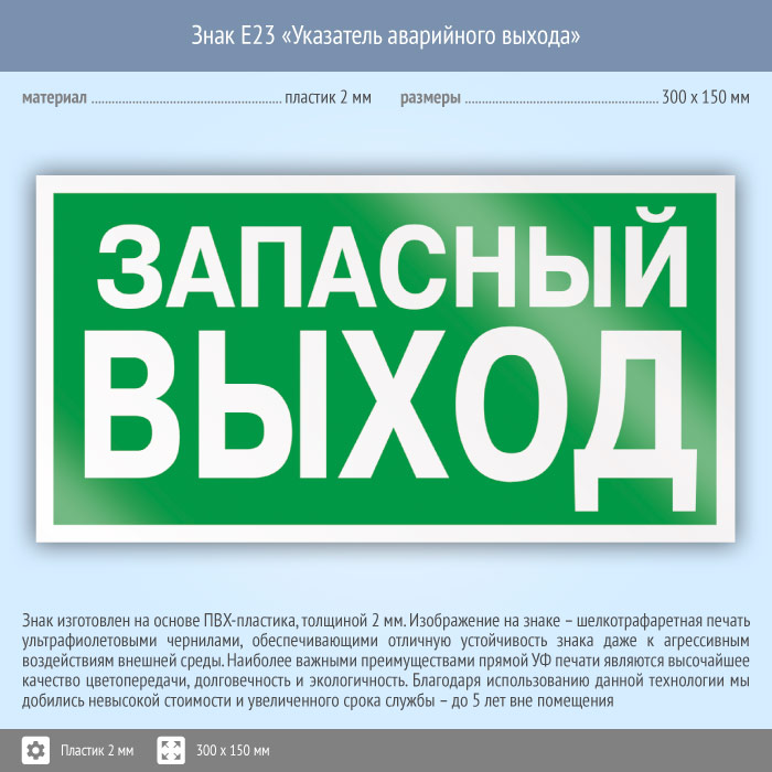 Знак E23 «Указатель запасного выхода» (устаревший) (пластик, 300х150 мм) в Сургуте купить