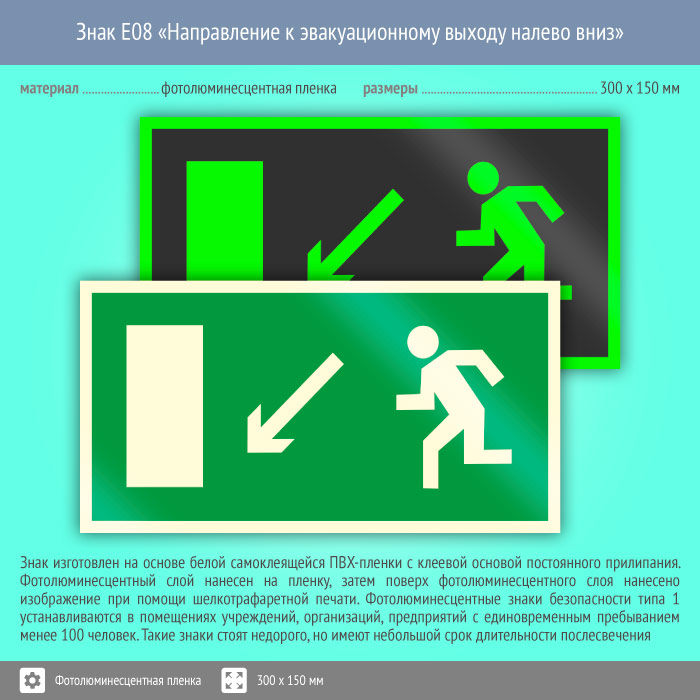Знак E08 «Направление к эвакуационному выходу налево вниз» (фотолюминесцентная пленка, 300х150 мм) в Сургуте купить