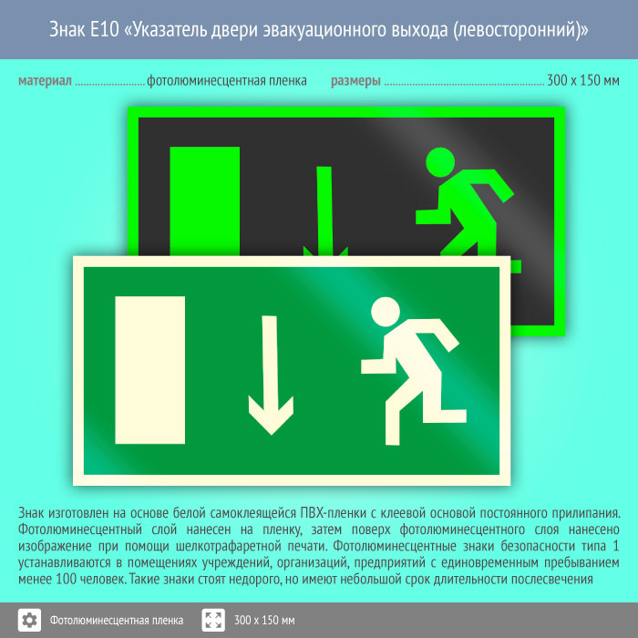 Знак E10 «Указатель двери эвакуационного выхода (левосторонний)» (фотолюминесцентная пленка, 300х150 мм) в Сургуте купить