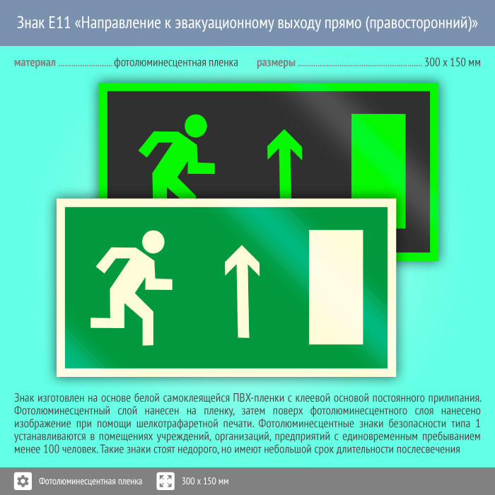 Знак E11 «Направление к эвакуационному выходу прямо (правосторонний)» (фотолюминесцентная пленка, 300х150 мм) в Сургуте купить