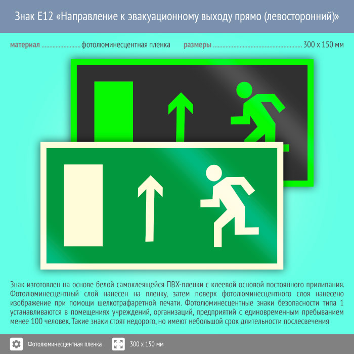 Знак E12 «Направление к эвакуационному выходу прямо (левосторонний)» (фотолюминесцентная пленка, 300х150 мм) в Сургуте купить