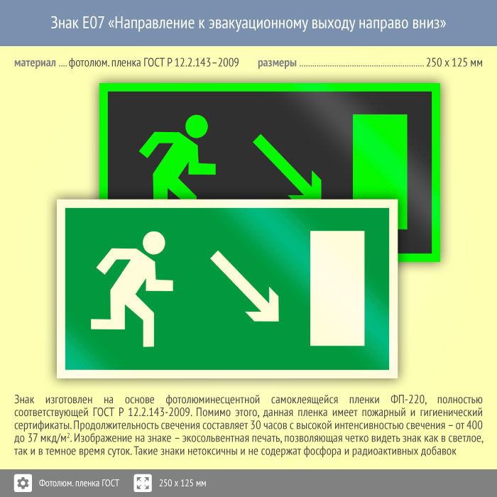 Знак E07 «Направление к эвакуационному выходу направо вниз» (фотолюминесцентная пленка ГОСТ 34428-2018, 250х125 мм) в Сургуте купить