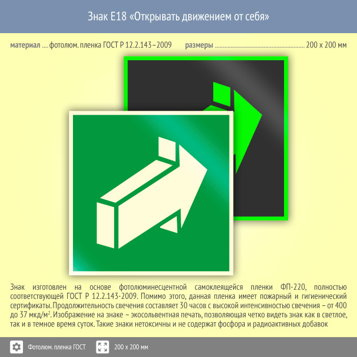 Знак E18 «Открывать движением от себя» (фотолюминесцентная пленка ГОСТ 34428-2018, 200х200 мм) в Сургуте купить
