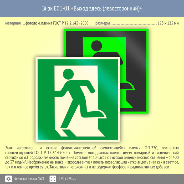 Знак E01-01 «Выход здесь (левосторонний)» (фотолюминесцентная пленка ГОСТ 34428-2018, 125х125 мм) в Сургуте купить