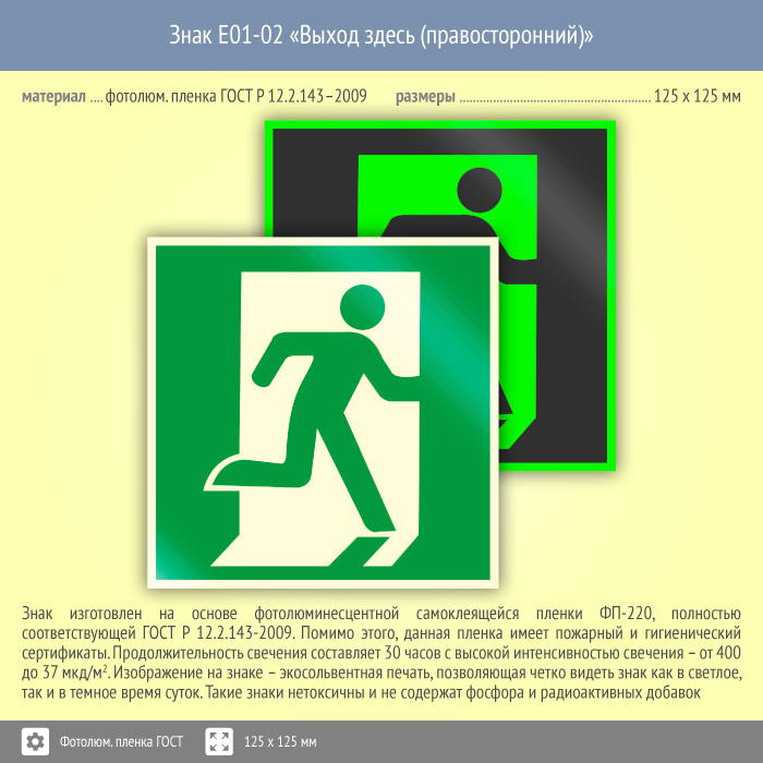 Знак E01-02 «Выход здесь (правосторонний)» (фотолюминесцентная пленка ГОСТ 34428-2018, 125х125 мм) в Сургуте купить