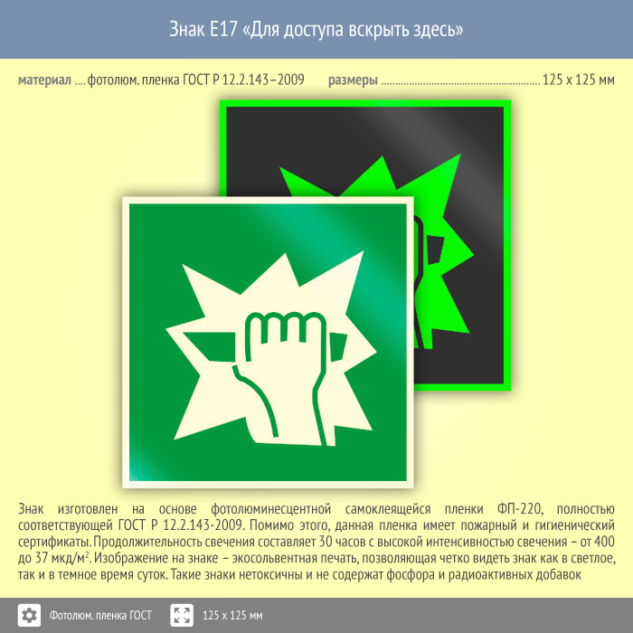 Знак E17 «Для доступа вскрыть здесь» (фотолюминесцентная пленка ГОСТ 34428-2018, 125х125 мм) в Сургуте купить