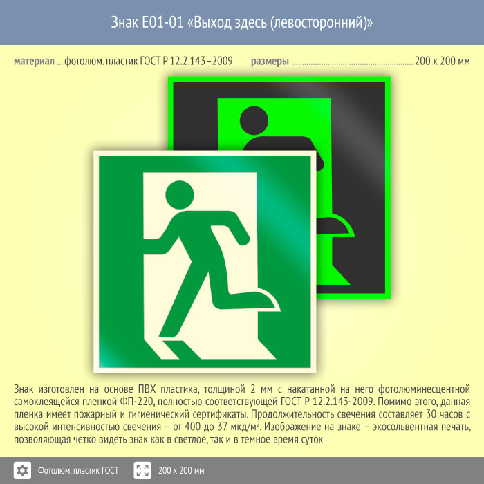 Знак E01-01 «Выход здесь (левосторонний)» (фотолюминесцентный пластик ГОСТ 34428-2018, 200х200 мм) в Сургуте купить