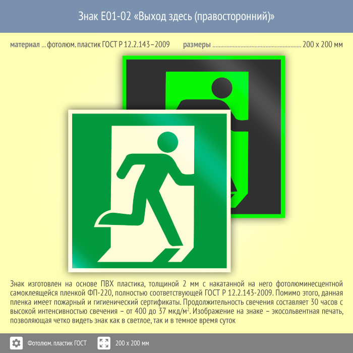 Знак E01-02 «Выход здесь (правосторонний)» (фотолюминесцентный пластик ГОСТ 34428-2018, 200х200 мм) в Сургуте купить