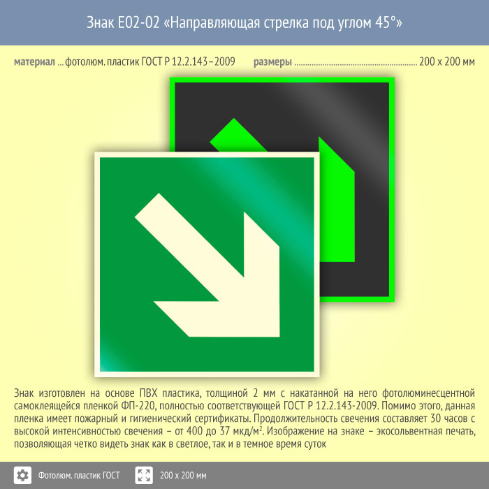 Знак E02-02 «Направляющая стрелка под углом 45°» (фотолюминесцентный пластик ГОСТ 34428-2018, 200х200 мм) в Сургуте купить