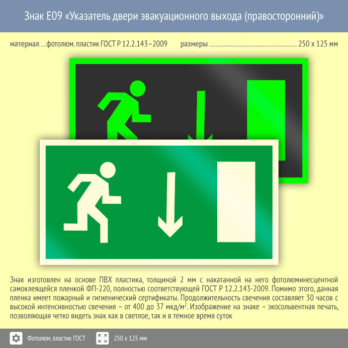 Знак E09 «Указатель двери эвакуационного выхода (правосторонний)» (фотолюминесцентный пластик ГОСТ 34428-2018, 250х125 мм) в Сургуте купить