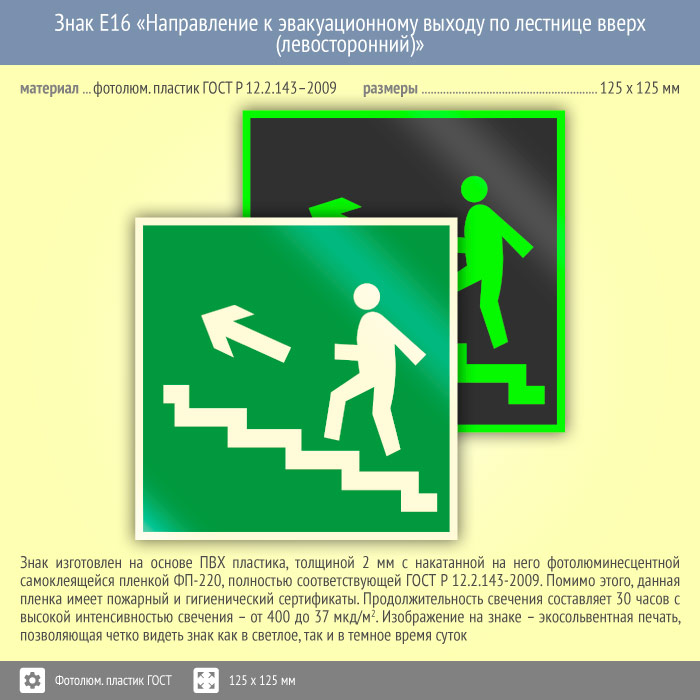 Знак E16 «Направление к эвакуационному выходу по лестнице вверх (левосторонний)» (фотолюминесцентный пластик ГОСТ 34428-2018, 125х125 мм) в Сургуте купить
