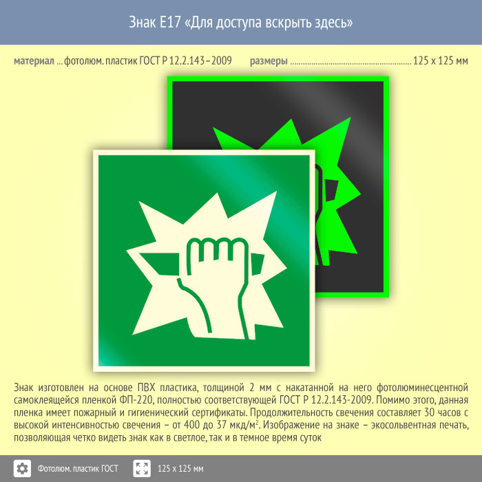 Знак E17 «Для доступа вскрыть здесь» (фотолюминесцентный пластик ГОСТ 34428-2018, 125х125 мм) в Сургуте купить