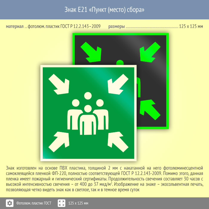 Знак E21 «Пункт (место) сбора» (фотолюминесцентный пластик ГОСТ 34428-2018, 125х125 мм) в Сургуте купить