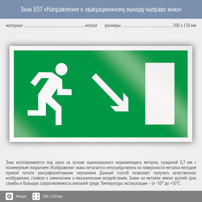 Знак E07 «Направление к эвакуационному выходу направо вниз» (металл, 300х150 мм) в Сургуте купить