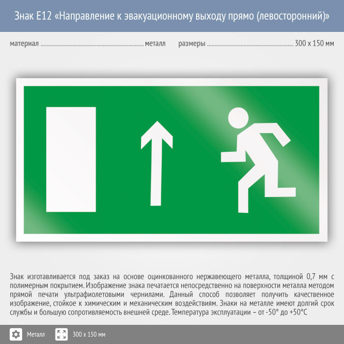 Знак E12 «Направление к эвакуационному выходу прямо (левосторонний)» (металл, 300х150 мм) в Сургуте купить