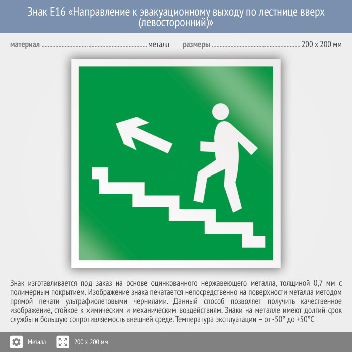 Знак E16 «Направление к эвакуационному выходу по лестнице вверх (левосторонний)» (металл, 200х200 мм) в Сургуте купить