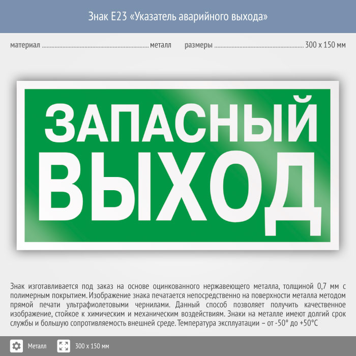 Знак E23 «Указатель запасного выхода» (устаревший) (металл, 300х150 мм) в Сургуте купить