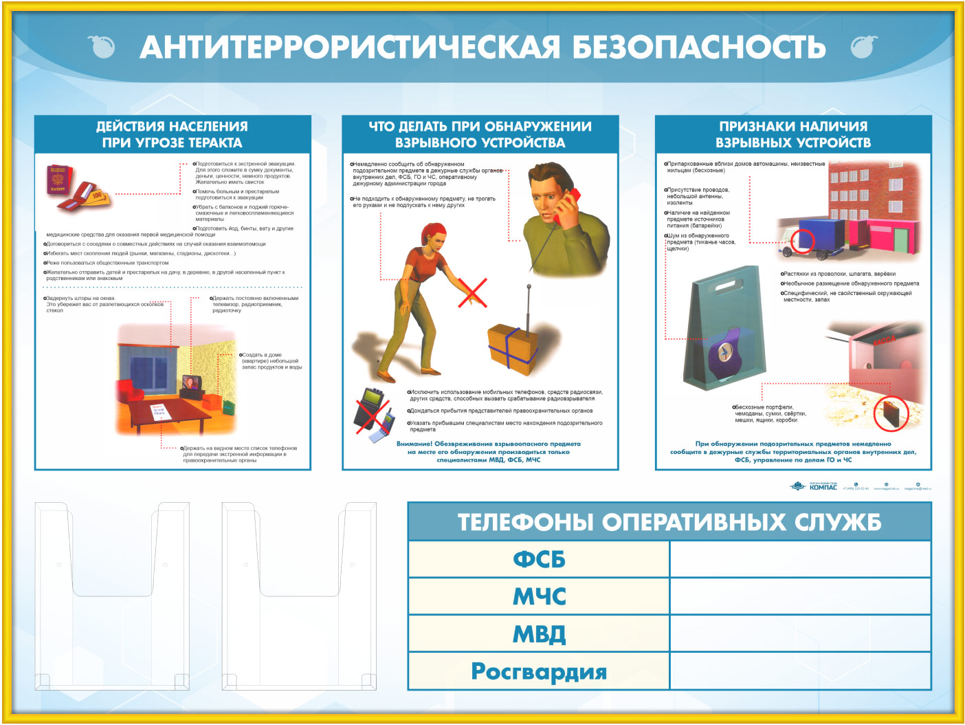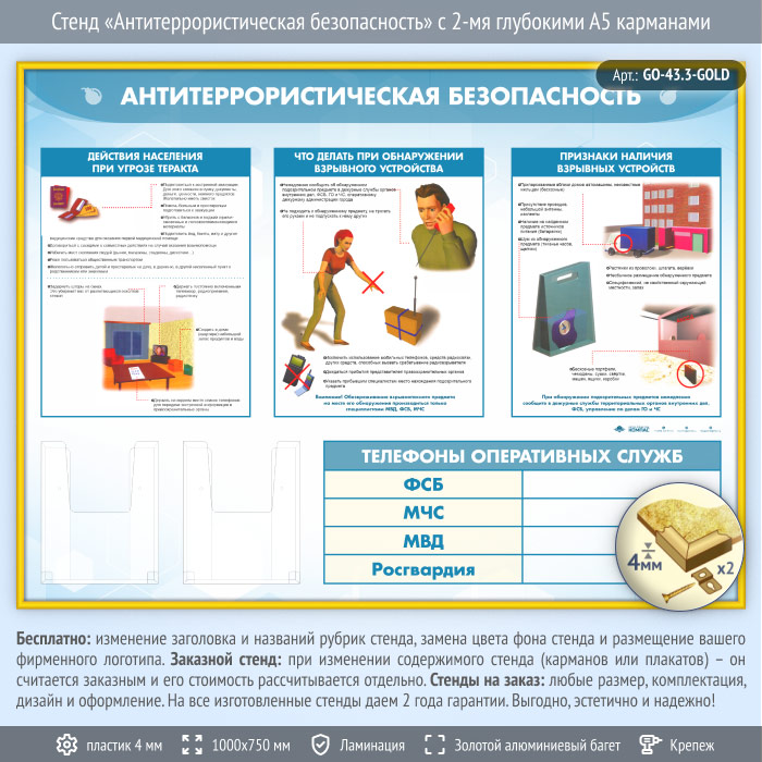 Стенд «Антитеррористическая безопасность» с 2-мя глубокими А5 карманами (GO-43.3-GOLD) в Сургуте купить
