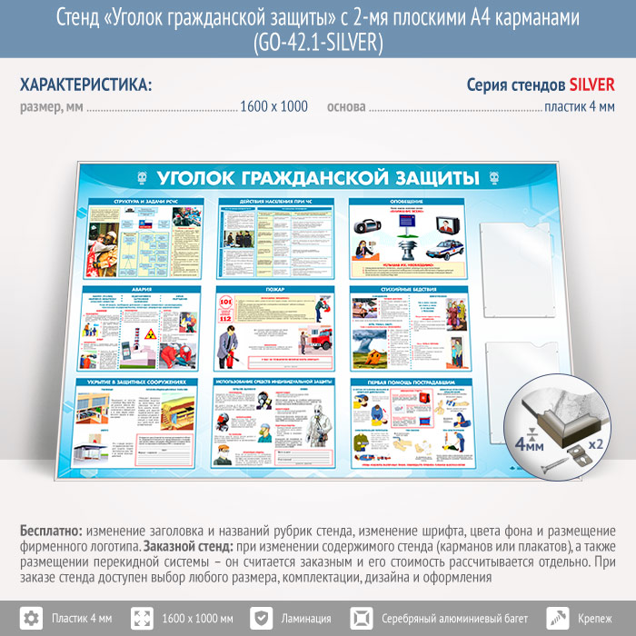 Стенд «Уголок гражданской защиты» с 2-мя плоскими А4 карманами (GO-42.1-SILVER) в Сургуте купить