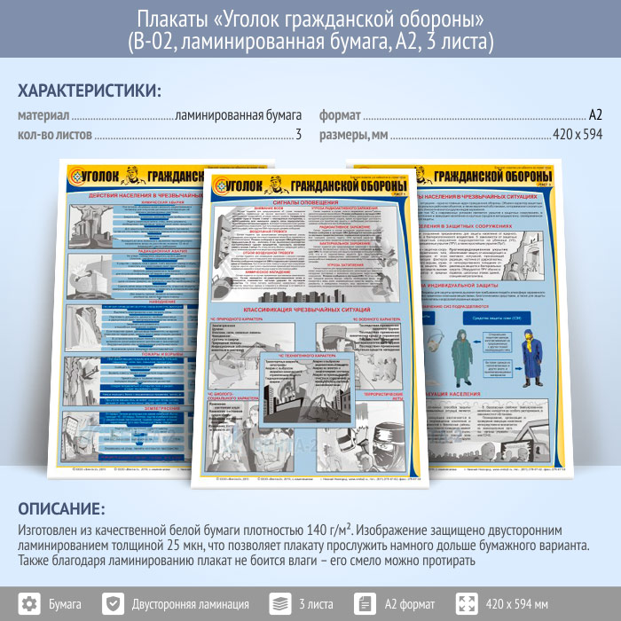 Плакаты «Уголок гражданской обороны» (В-02, ламинированная бумага, А2, 3 листа) в Сургуте купить