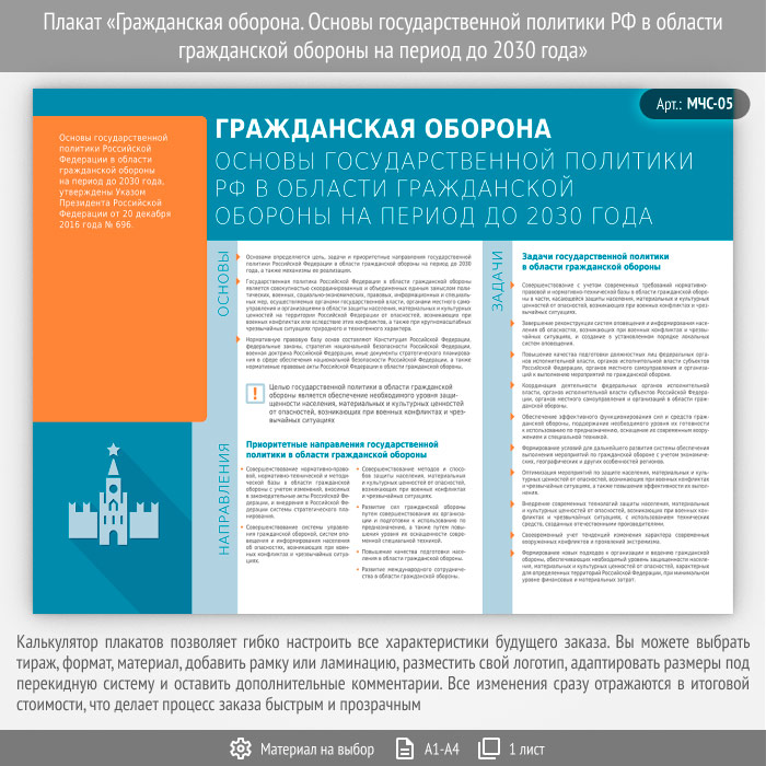 Плакат «Гражданская оборона. Основы государственной политики РФ в области гражданской обороны на период до 2030 года» (МЧС-05, 1 лист) в Сургуте купить