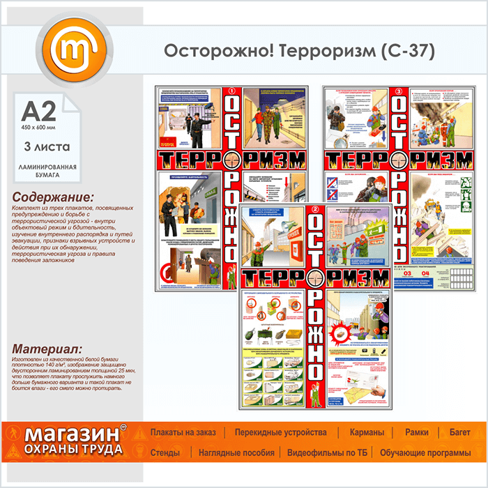 Плакаты «Осторожно! Терроризм» (С-37, ламинированная бумага, А2, 3 листа) в Сургуте купить