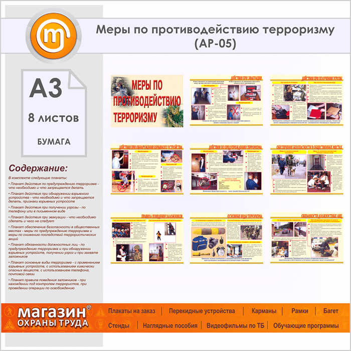 Плакаты «Меры по противодействию терроризму» (АР-05, бумага, А3, 8 листов) в Сургуте купить