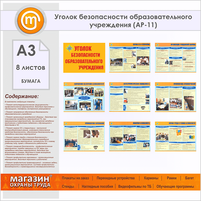 Плакаты «Уголок безопасности образовательного учреждения» (АР-11, бумага, А3, 8 листов) в Сургуте купить