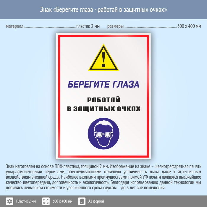 Знак «Берегите глаза - работай в защитных очках», КЗ-04 (пластик, 300х400 мм) в Сургуте купить