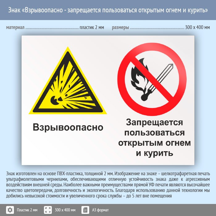 Знак «Взрывоопасно - запрещается пользоваться открытым огнем и курить», КЗ-07 (пластик, 400х300 мм) в Сургуте купить