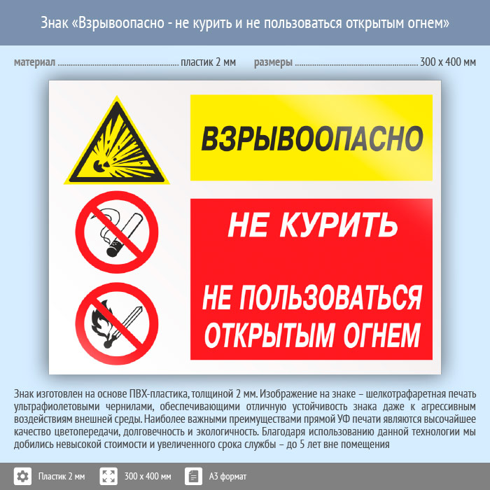 Знак «Взрывоопасно - не курить и не пользоваться открытым огнем», КЗ-09 (пластик, 400х300 мм) в Сургуте купить