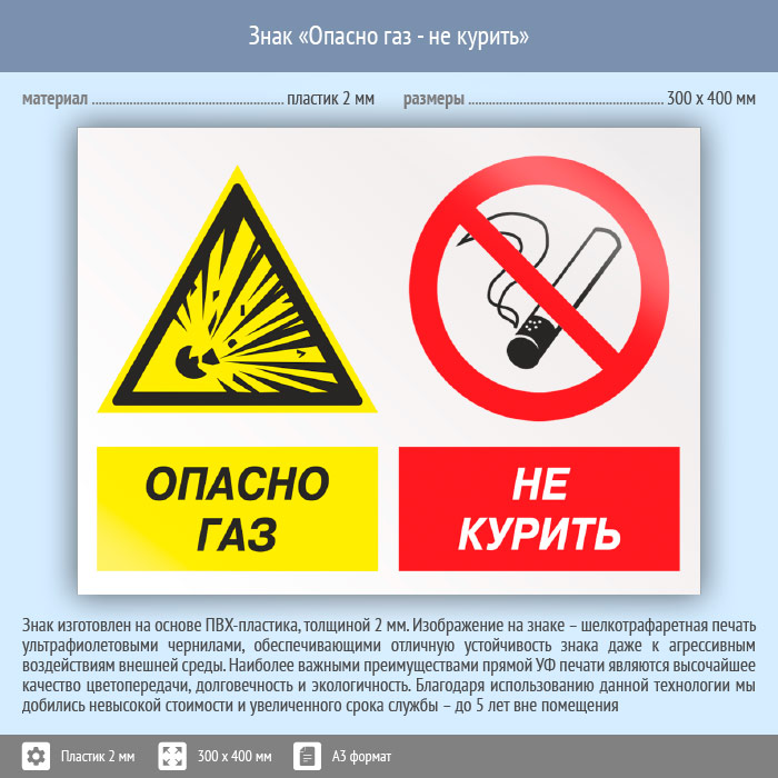 Знак «Опасно газ - не курить», КЗ-44 (пластик, 400х300 мм) в Сургуте купить