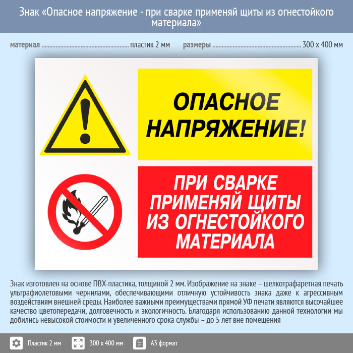 Знак «Опасное напряжение - при сварке применяй щиты из огнестойкого материала», КЗ-46 (пластик, 400х300 мм) в Сургуте купить