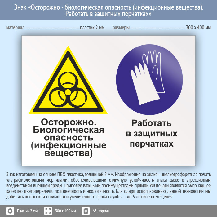 Знак «Осторожно - биологическая опасность (инфекционные вещества). Работать в защитных перчатках», КЗ-52 (пластик, 400х300 мм) в Сургуте купить