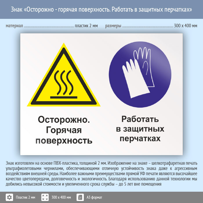 Знак «Осторожно - горячая поверхность. Работать в защитных перчатках», КЗ-55 (пластик, 400х300 мм) в Сургуте купить