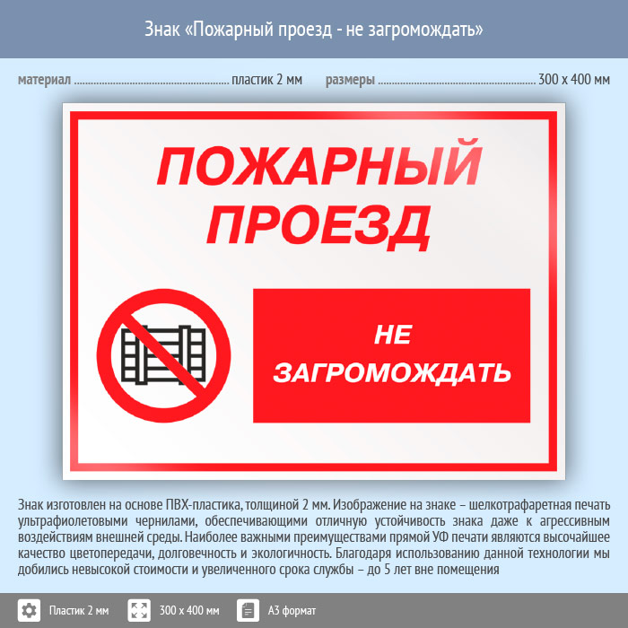 Знак «Пожарный проезд - не загромождать», КЗ-67 (пластик, 400х300 мм) в Сургуте купить