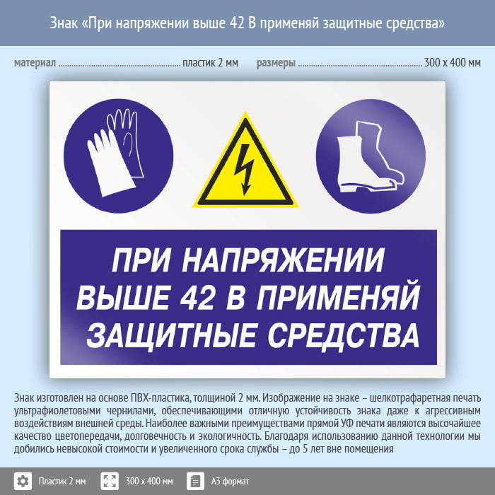 Знак «При напряжении выше 42 В применяй защитные средства», КЗ-72 (пластик, 400х300 мм) в Сургуте купить