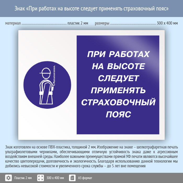 Знак «При работах на высоте следует применять страховочный пояс», КЗ-75 (пластик, 400х300 мм) в Сургуте купить