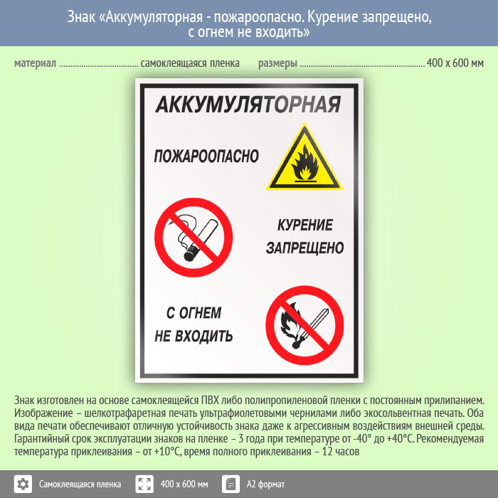 Знак «Аккумуляторная - пожароопасно. Курение запрещено, с огнем не входить», КЗ-01 (пленка, 400х600 мм) в Сургуте купить