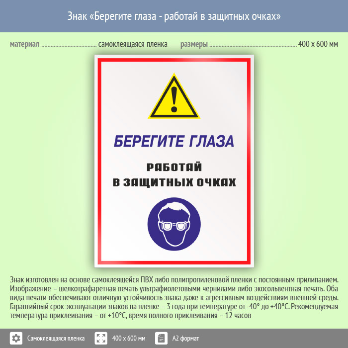 Знак «Берегите глаза - работай в защитных очках», КЗ-04 (пленка, 400х600 мм) в Сургуте купить