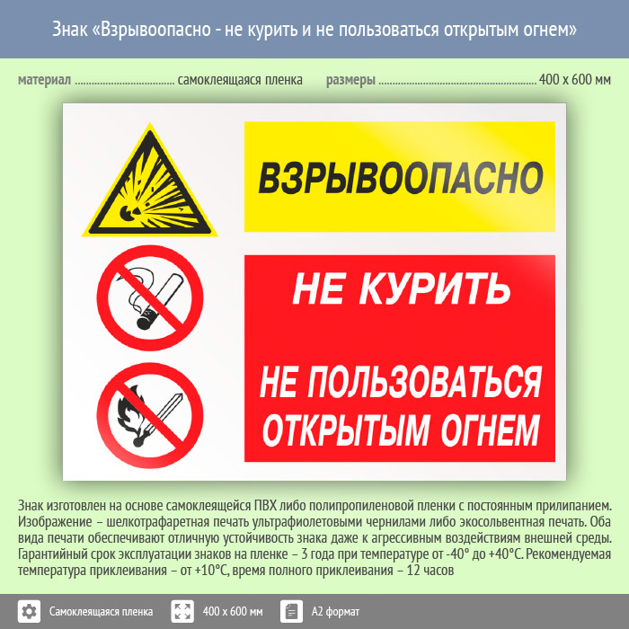 Знак «Взрывоопасно - не курить и не пользоваться открытым огнем», КЗ-09 (пленка, 600х400 мм) в Сургуте купить