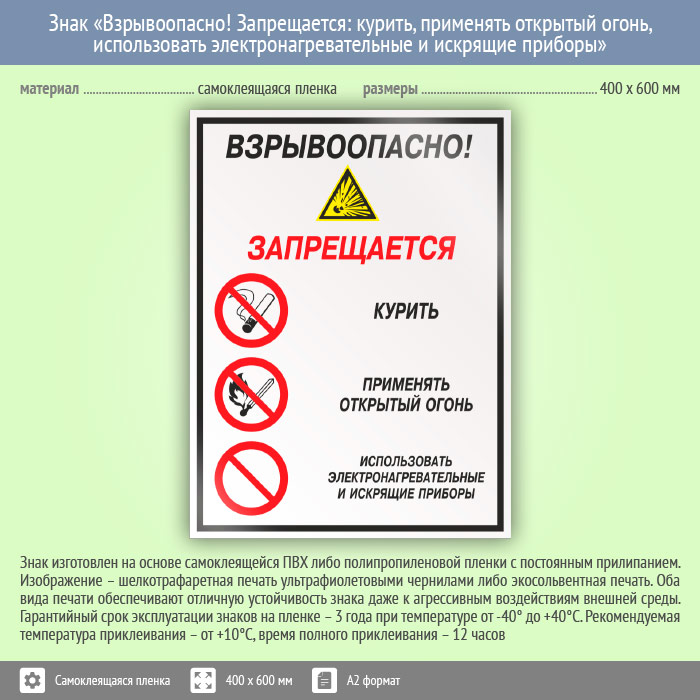 Знак «Взрывоопасно! Запрещается: курить, применять открытый огонь, использовать электронагревательные и искрящие приборы», КЗ-10 (пленка, 400х600 мм) в Сургуте купить