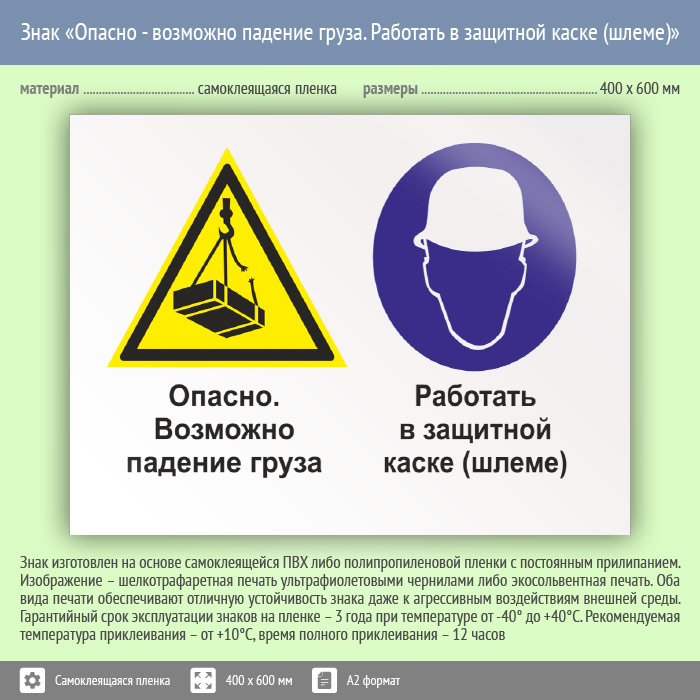 Знак «Опасно - возможно падение груза. Работать в защитной каске (шлеме)», КЗ-34 (пленка, 600х400 мм) в Сургуте купить