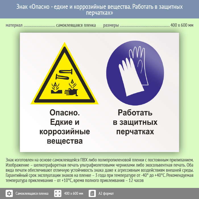 Знак «Опасно - едкие и коррозийные вещества. Работать в защитных перчатках», КЗ-36 (пленка, 600х400 мм) в Сургуте купить